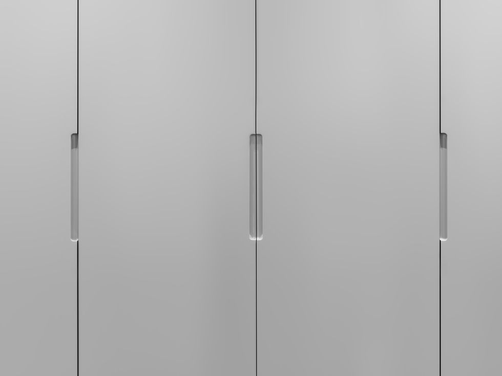 Off white matt lacquared with walnut interior + Glazed doors & carved handles